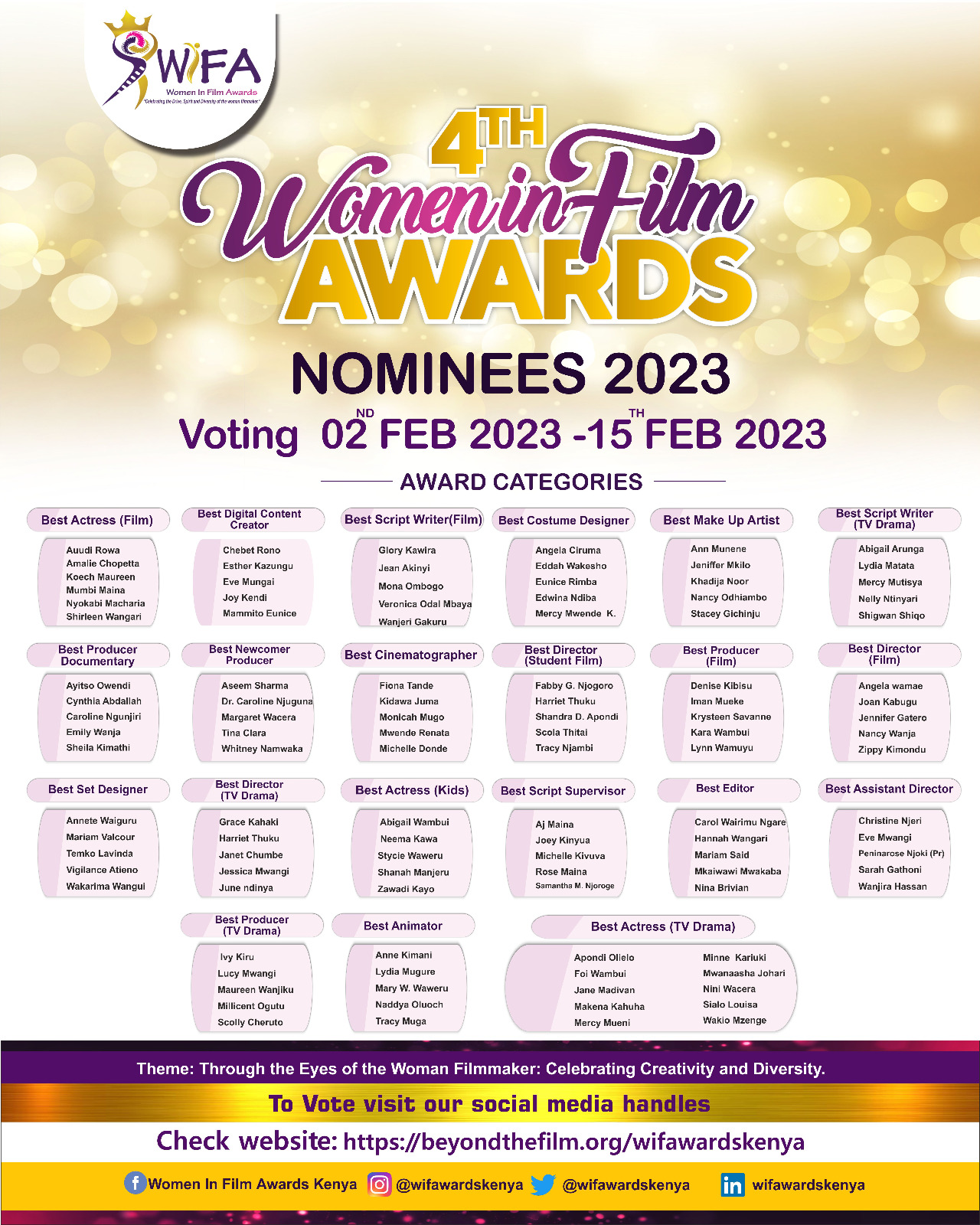 Welcome to the 4th edition of Women in Film Awards (WIFA). WIF Awards is an opportunity to recognise women filmmakers in Kenya. This year award theme is ” Through the eyes of the woman filmmaker: celebrating creativity and diversity
