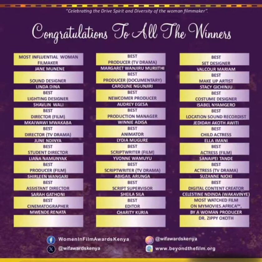 The Women in Film Awards (WIFA) is delighted to officially announce the WIFA 2025 Winners, marking another milestone in our commitment to recognizing and uplifting women who continue to shape and redefine Kenya’s film and screen industries.